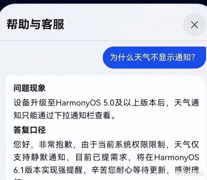 华为鸿蒙6.1版本的首次曝光,并非来自盛大的发布会,而是源于一个用户痛点的解决。在HarmonyOS 5.0及以上版本中,天气应用的通知机制存在局限:天气预警信息只能通过下拉通知栏静默显示,无法像其他应用那样触发强提醒。