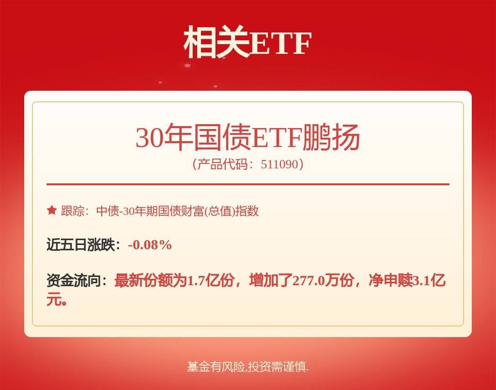 风险提示:中债-30年期国债财富(总值)指数(代码:CBA21801.CS)来源于中债金融估值中心有限公司(“中债”)。本基金为被动投资的交易型开放式指数基金,主要采用抽样复制策略,跟踪标的指数市场表现,具有与标的指数所表征的市场相似的风险收益特征。投资者投资于本基金面临标的指数回报与相应市场平均回报偏离、标的指数波动、跟踪误差控制未达约定目标、标的指数变更、指数编制机构停止服务、成份券停牌或违约等潜在风险。