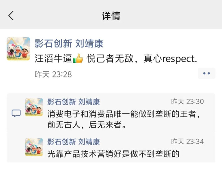 表面上,刘靖康多次公开表达对“老大哥”大疆的敬意,将其奉为行业标杆;在影视Q3财报发布后,他更在社交媒体上坦言“光靠产品技术营销好是做不到垄断的”,展现出一副谦逊姿态。