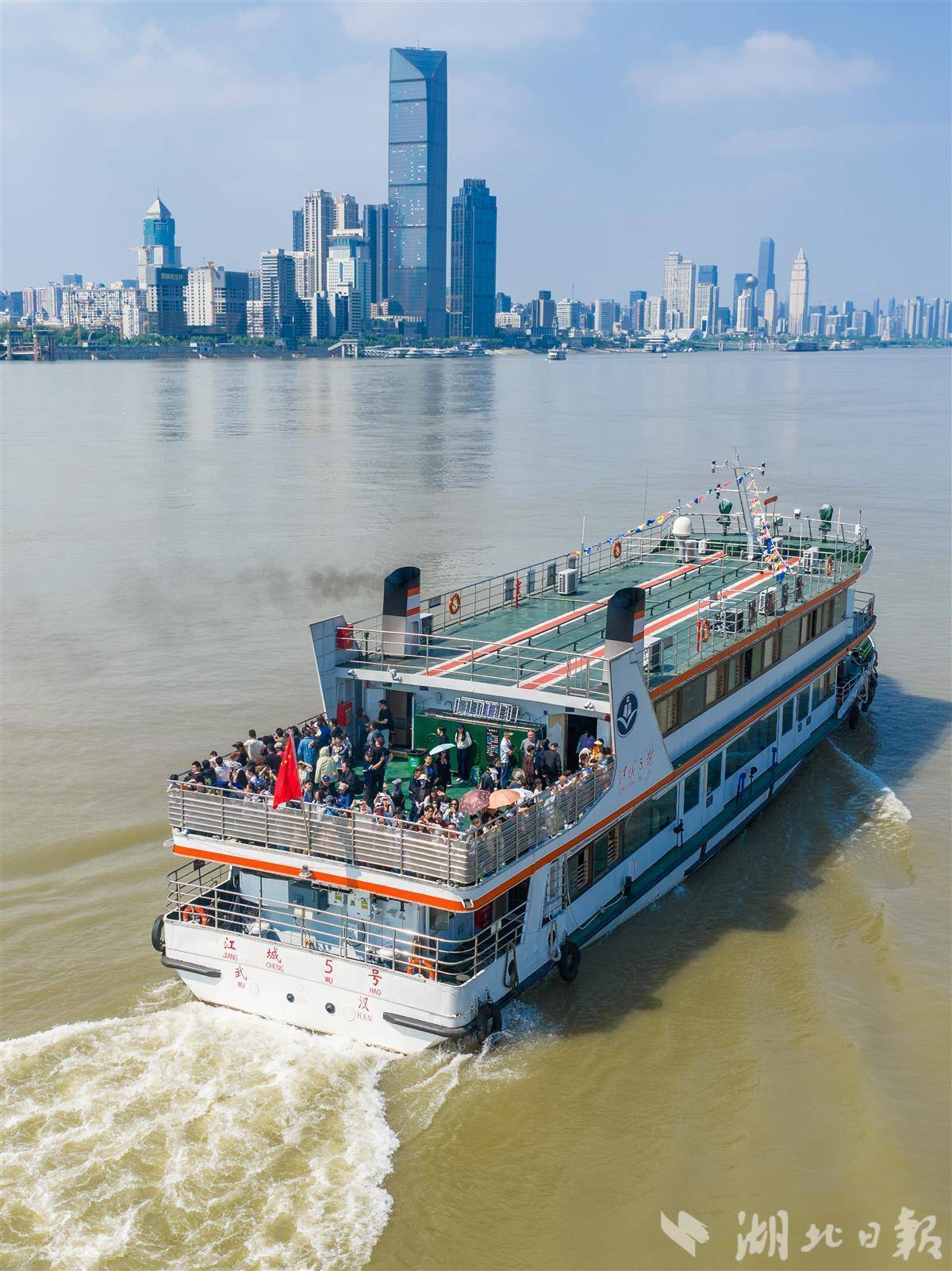 4月30日,游客乘坐武汉轮渡,登上二层甲板,一览武汉两江四岸风光。